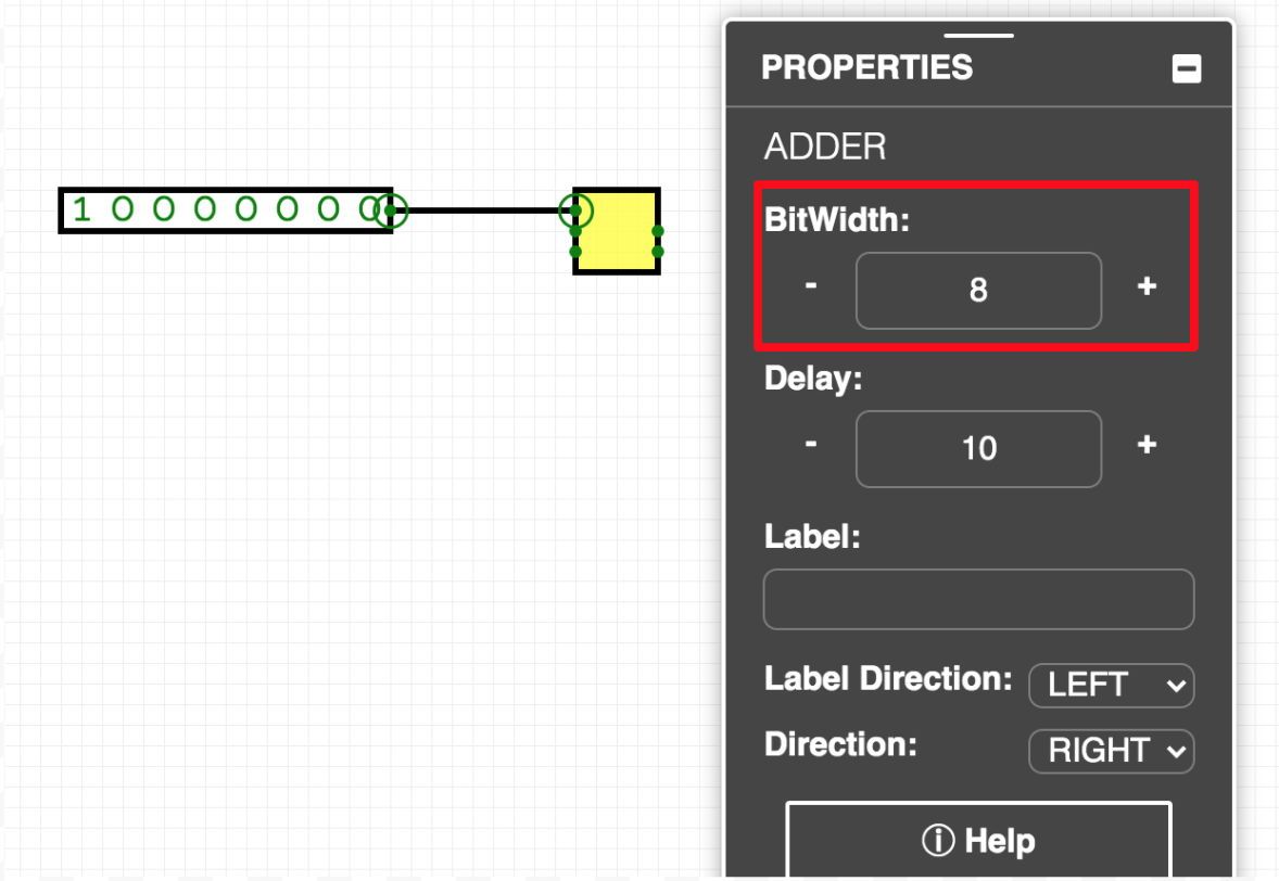 Mind those circuit element properties: Use the PROPERTIES panel smartly while designing your circuit. Consider that you are building an adder that receives eight bits as an input. As Figure 2.57 illustrates, the BitWidth property attribute of the Adder circuit element must be set to eight bits in the PROPERTIES panel. Any input circuit elements connected to the 8-bit adder should also be 8 bits wide. Thus, the BitWidth property attribute of the Input circuit elements in Figure 2.57 has been also set to eight bits.
