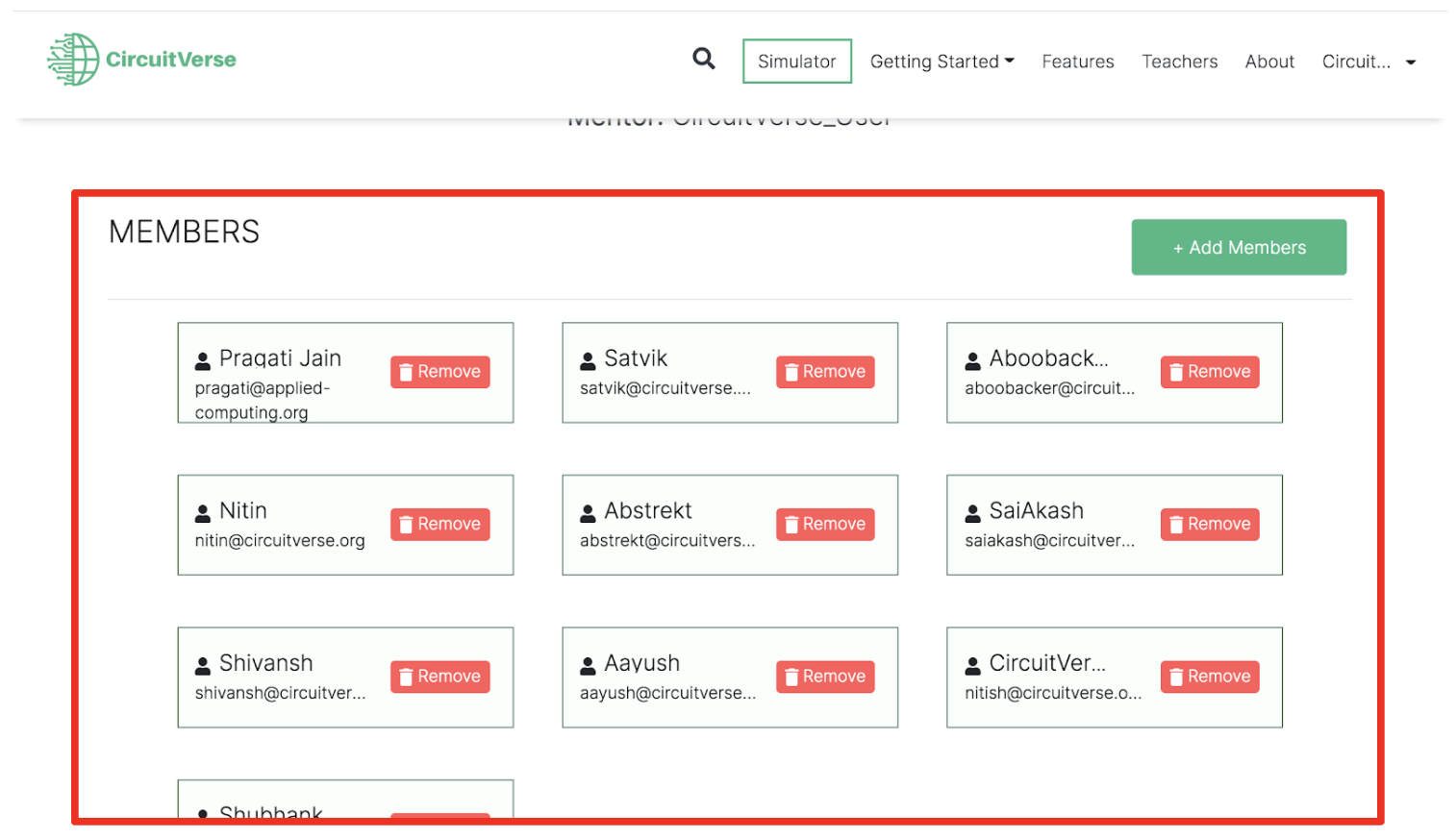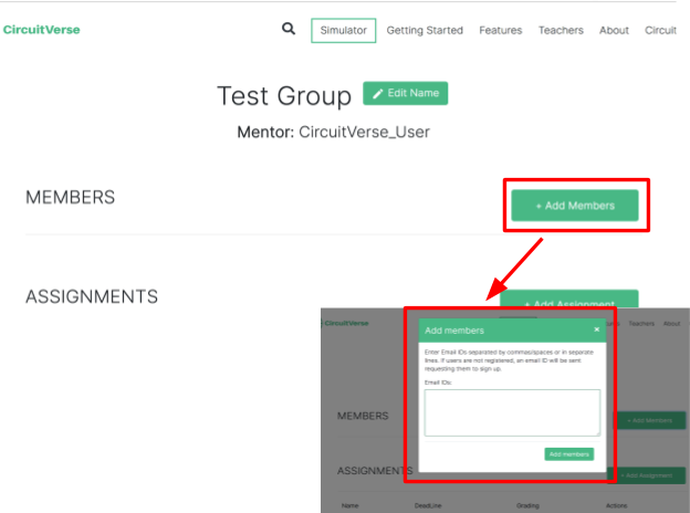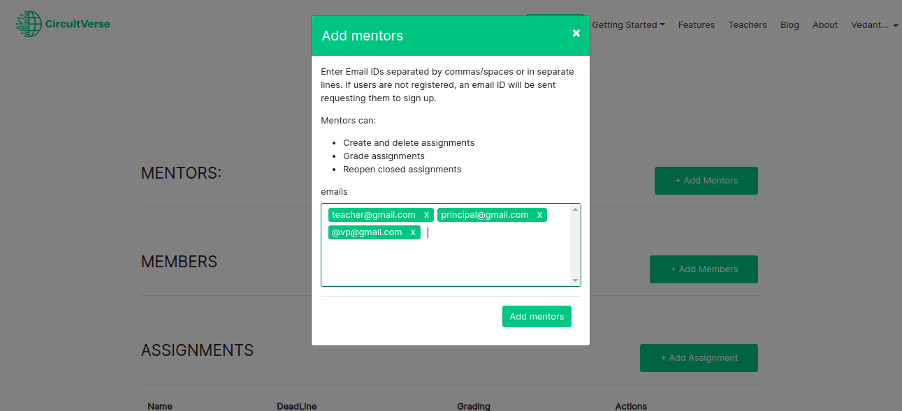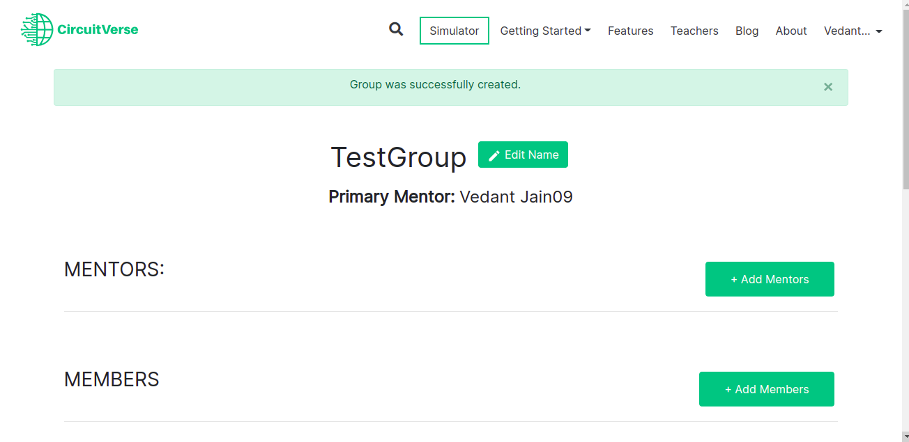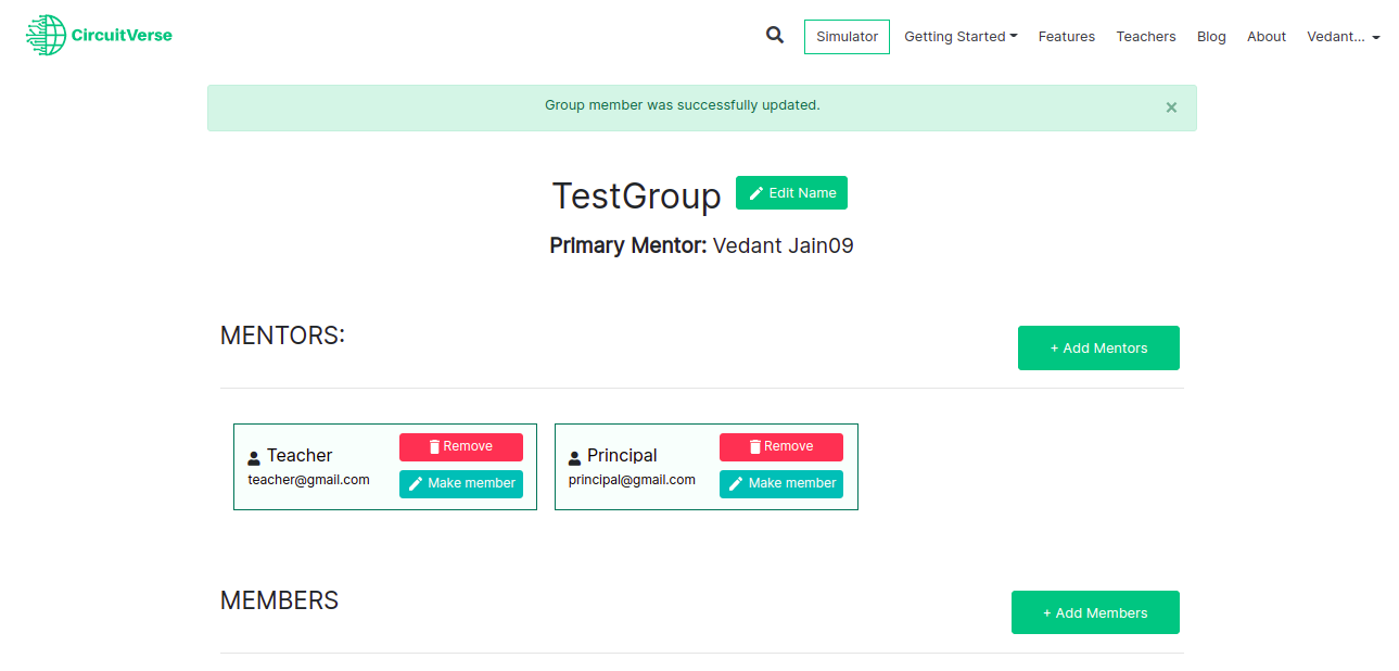 NOTE: If a mentor is already registered with CircuitVerse, the mentor will be added automatically. Alternatively, the mentor receives an email invitation to register with CircuitVerse. Once the mentor completes the registration process, they will be automatically added/listed to the group.