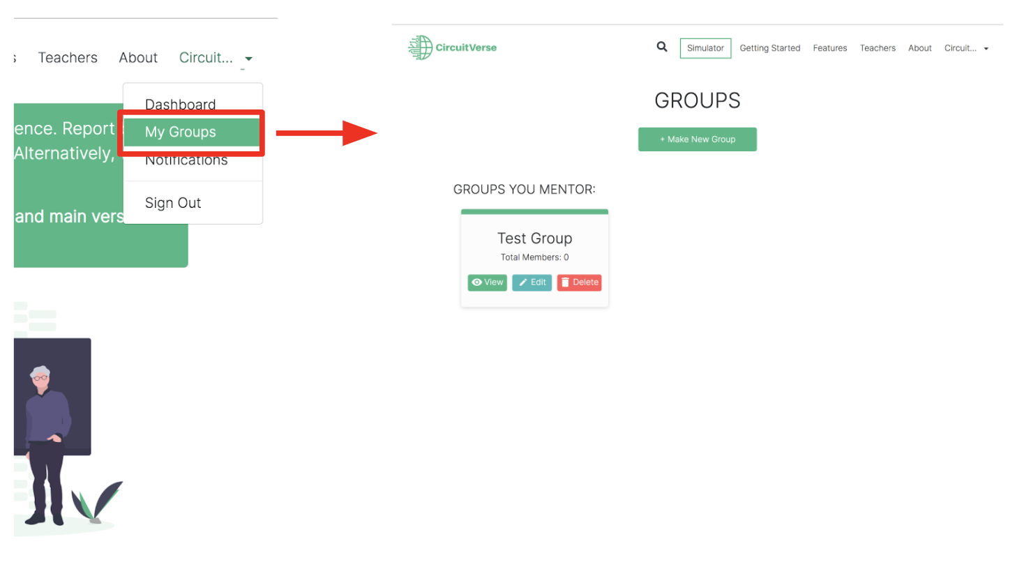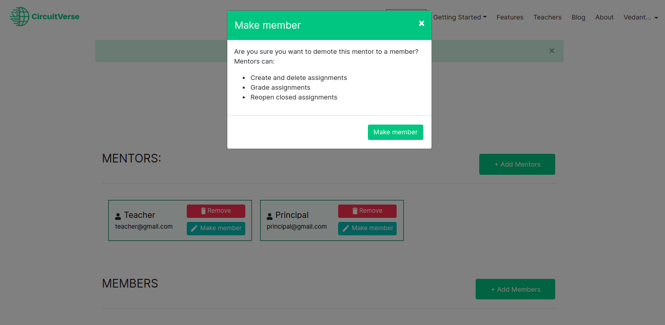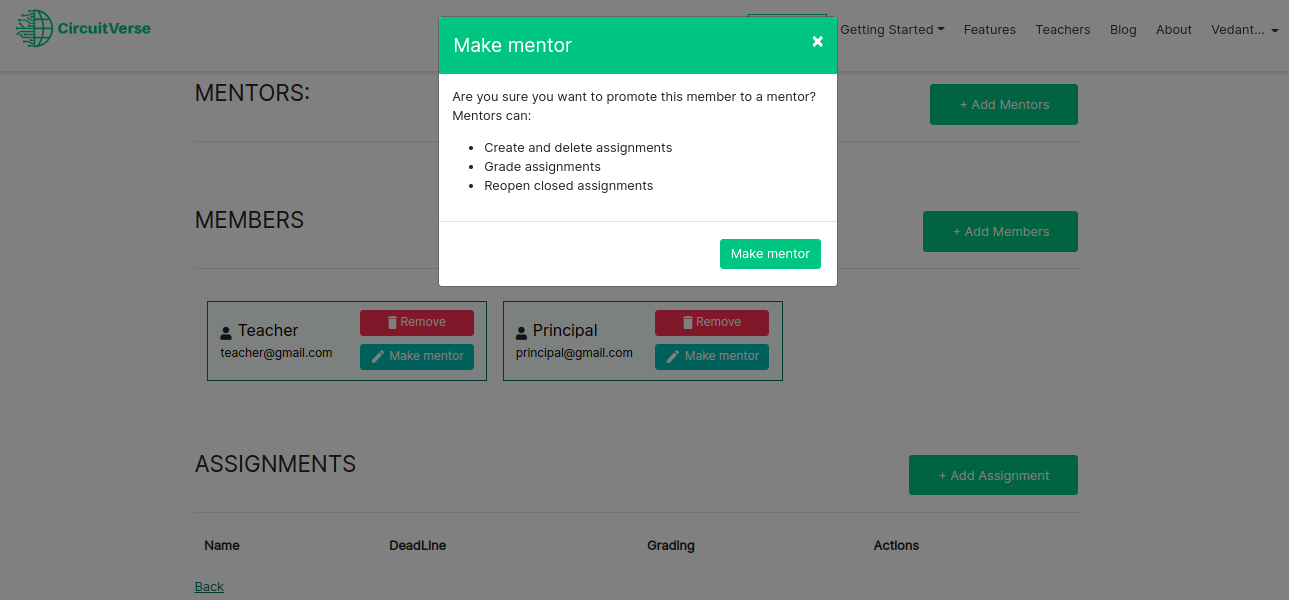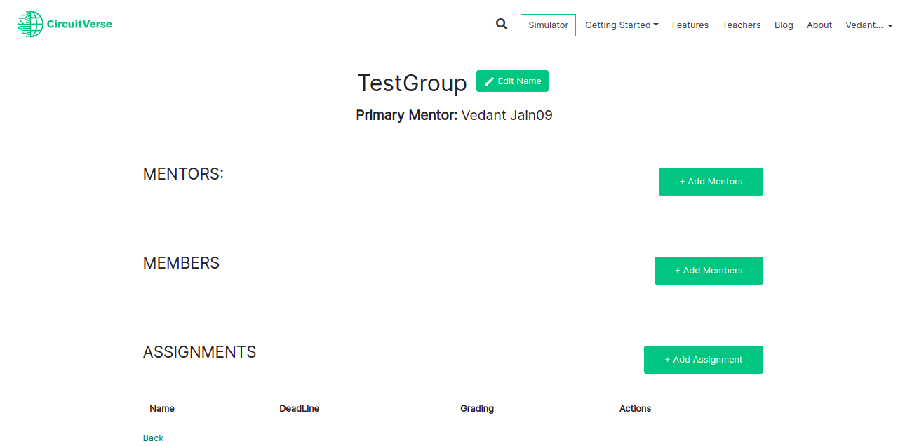 NOTE: If a mentor is already registered with CircuitVerse, the mentor will be added automatically. Alternatively, the mentor receives an email invitation to register with CircuitVerse. Once the mentor completes the registration process, they will be automatically added/listed to the group.