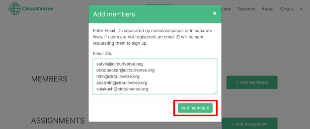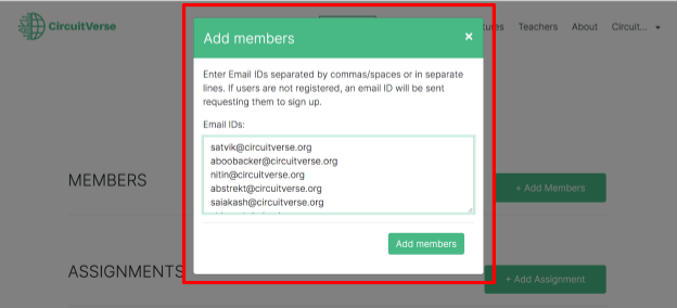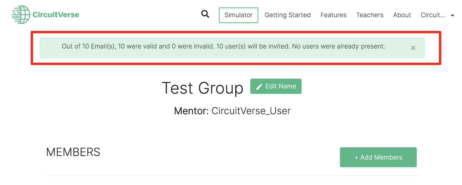 NOTE: If a student is already registered with CircuitVerse, the student will be added automatically. Alternatively, the student receives an email invitation to register with CircuitVerse. Once the student completes the registration process, they will be automatically added/listed to the group. Refer to Figure 2.16.