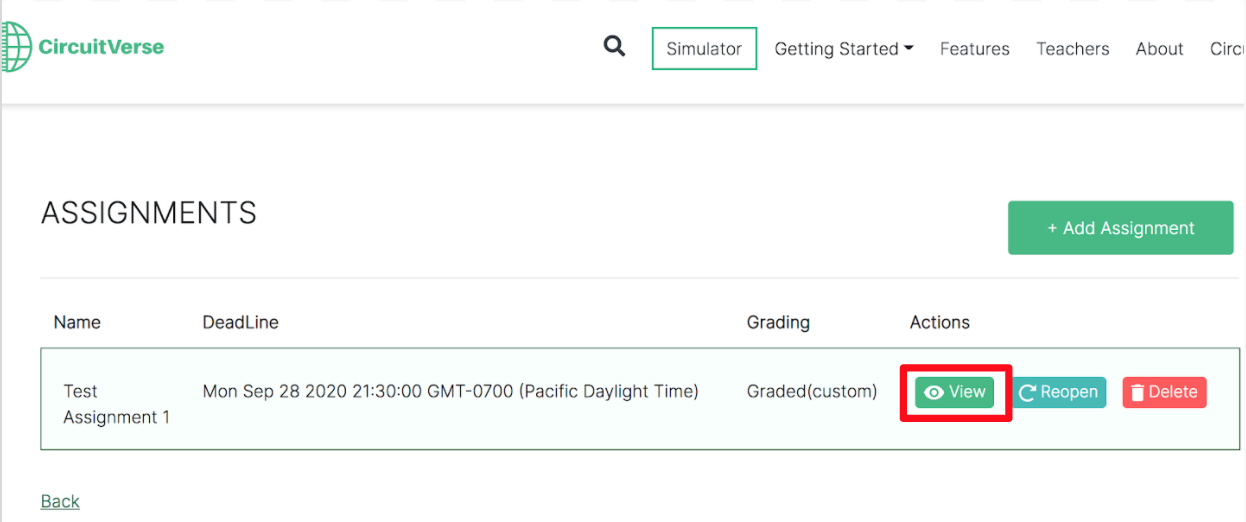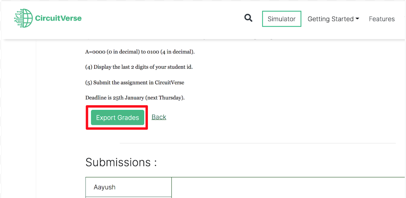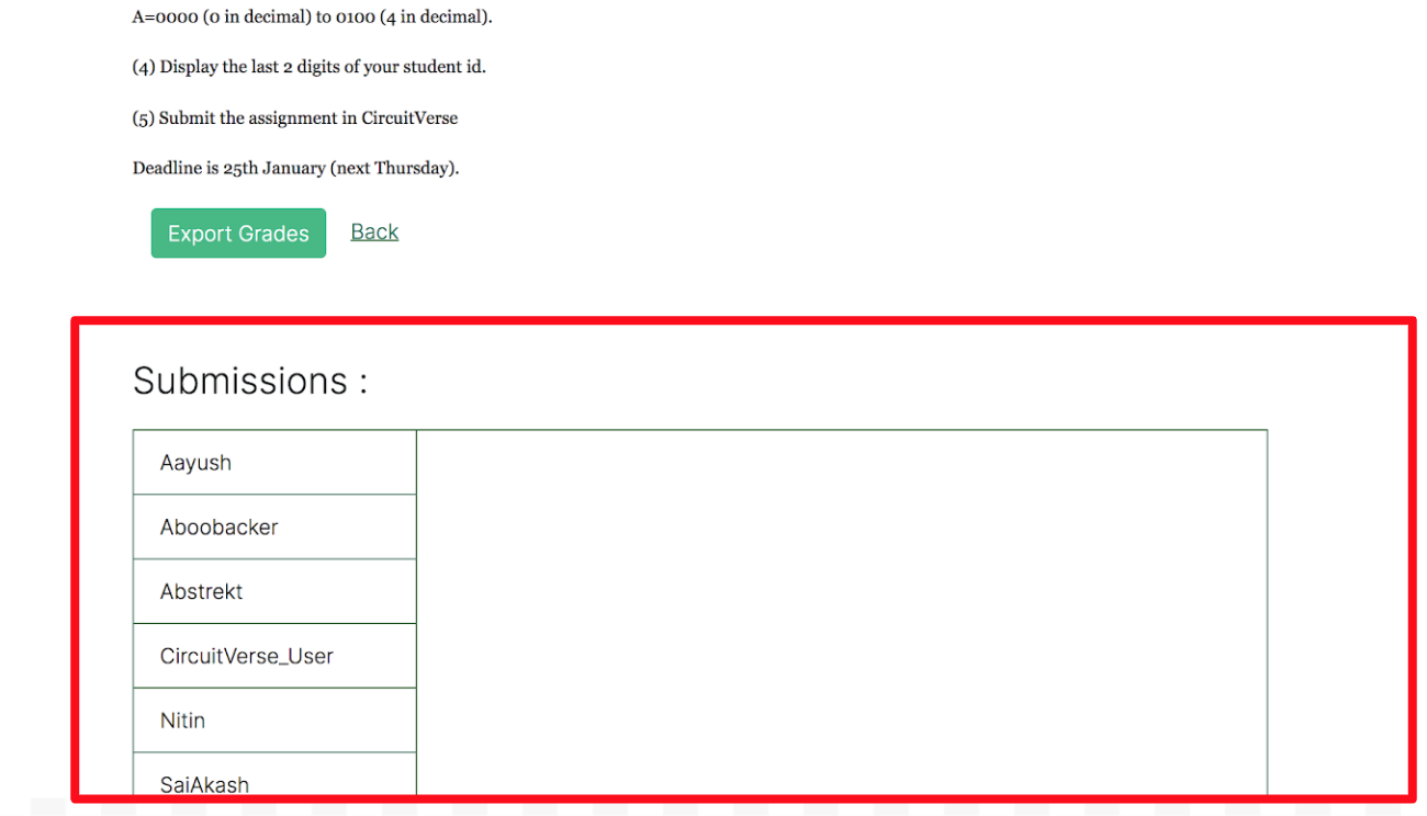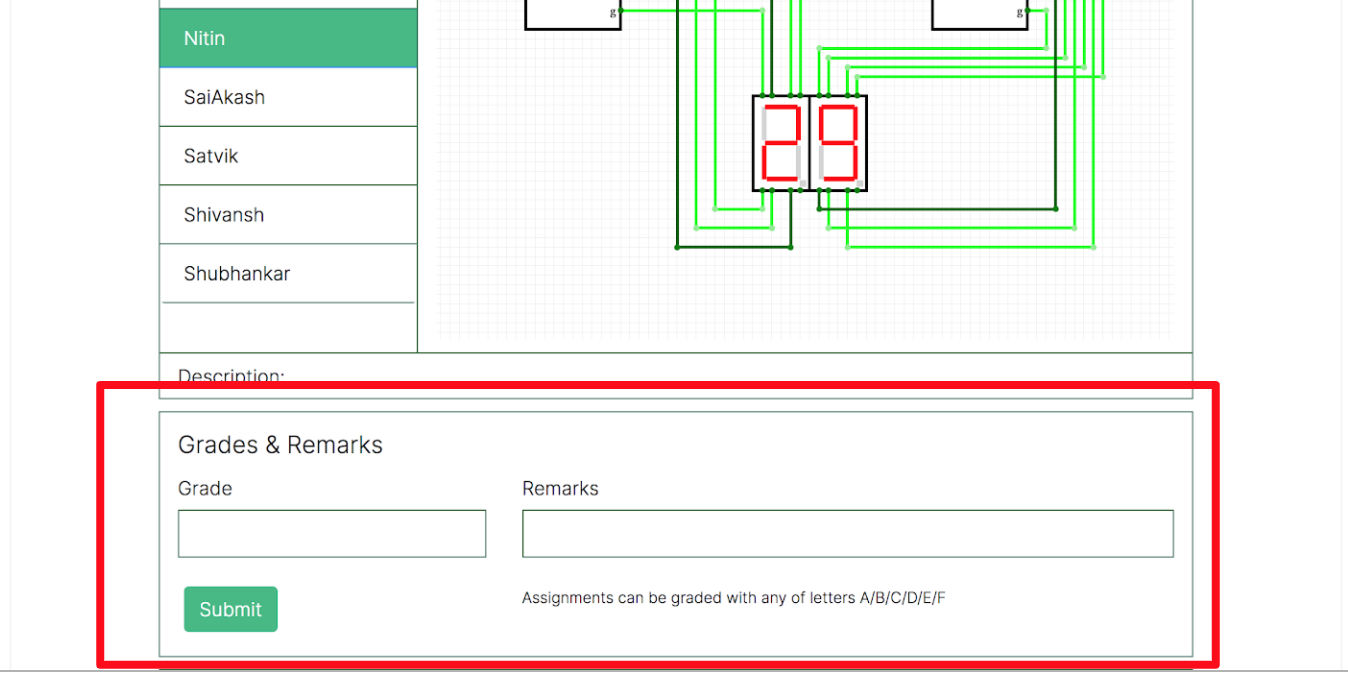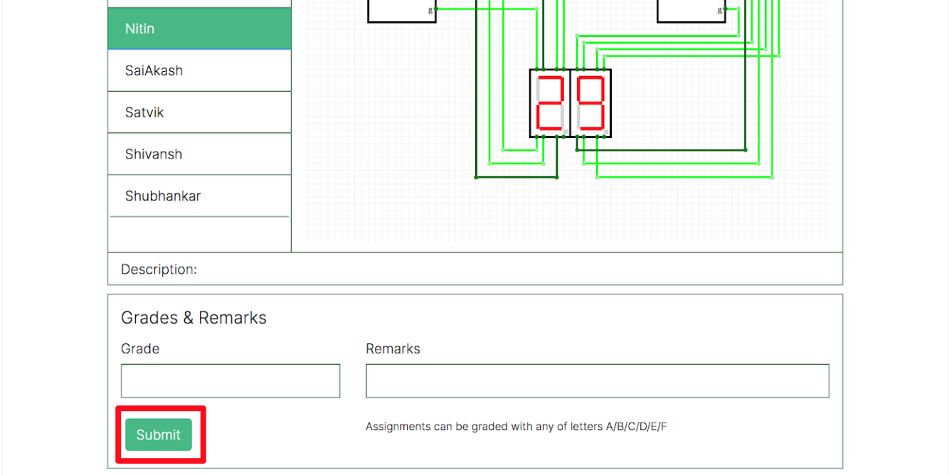 After the grading scale has been set and the assignment deadline has passed, the grades can be added or updated. Follow the below steps to grade assignments within CircuitVerse.