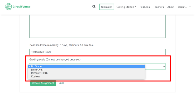 Choose a grading scale from the Grading scale drop-down menu as shown in Figure 2.24. Refer to Table 2.2 for a brief description of the different grading scales available within the CircuitVerse simulator.