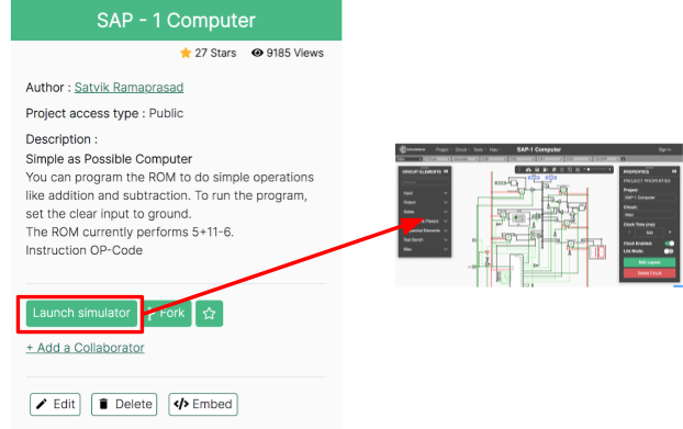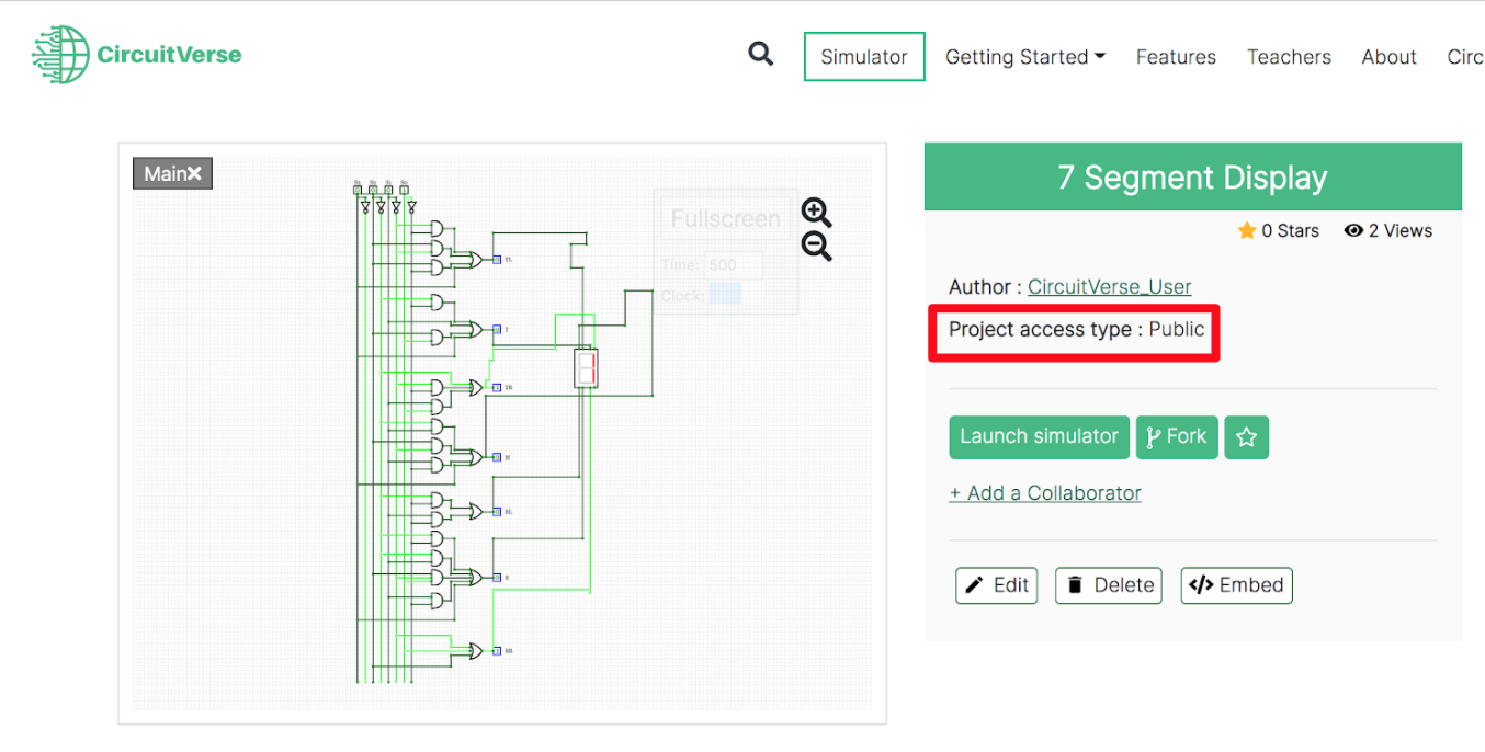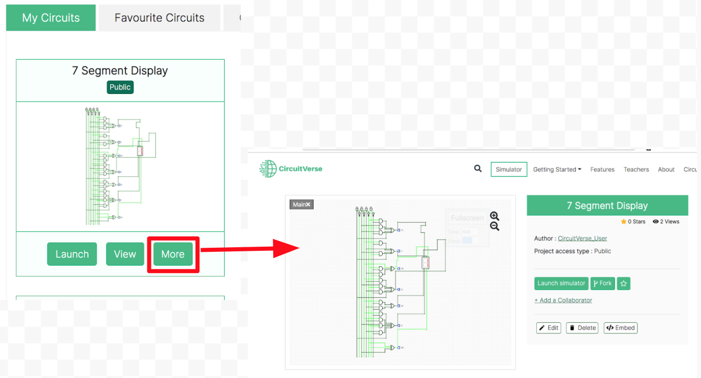 NOTE: Images for circuit simulation projects that are part of a CircuitVerse user account can only be downloaded. As needed, a user can fork an existing circuit contribution to add the CircuitVerse project to their dashboard.