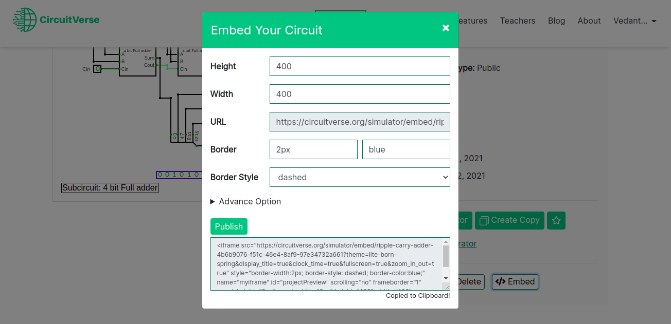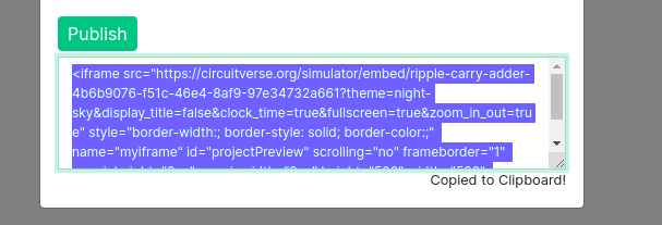 Click on the Publish button to update the embed link with the updated changes in the configurations. The embed link will be copied to your clipboard and is ready to render/embed your circuit. Refer to Figure 2.48.3.