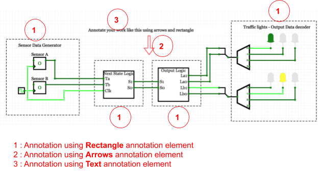 The Text annotation element allows users to add multi-line text to share more information about the live circuit––circuit logic design details of the circuit, expected behavior of the circuit, etc.. Refer Figure 4.14.